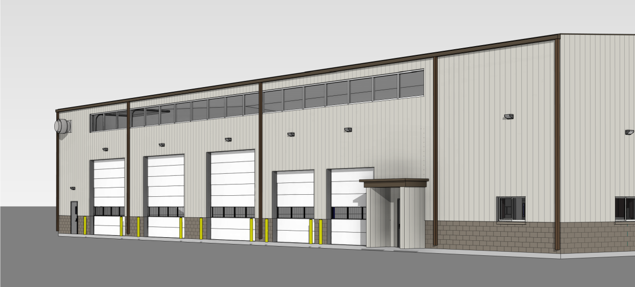 The buildings are constructed as a combination of Type II non-combustible materials including CMU, steel, and cast concrete. The exterior is finished with split-faced CMU, vertical metal paneling, and high windows on each facade for adequate daylighting and reduced energy consumption. Operable overhead bridge cranes are supplemented with vehicle lift stations, air compressors, pneumatic hose reels, equipment storage racks, high bay lighting, and suspended HVAC systems. The shop is equipped with an automatic sprinkler system for active fire suppression and code compliance.