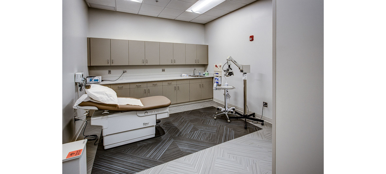 The new building is a 6,297sq.ft. clinic which includes a new lab, eight exam rooms, three specialty exam rooms and associated support spaces. With an emphasis on design, this new building will allow clients feel they are in a high end but comfortable environment. Special design considerations include protected spaces for weight stations, changing spaces and blood draw. There are also two corridor breakout spaces for family or friends who are with the patient but do not want to be in attendance during more intimate exams. BG has worked closely with the contractor and interior designer to select finishes and interior design that cohesively evoke both a modern and natural design, with materials including metal and cementious panels, natural stone, wood, and an emphasis on pulling material from the exterior to the interior of the space.